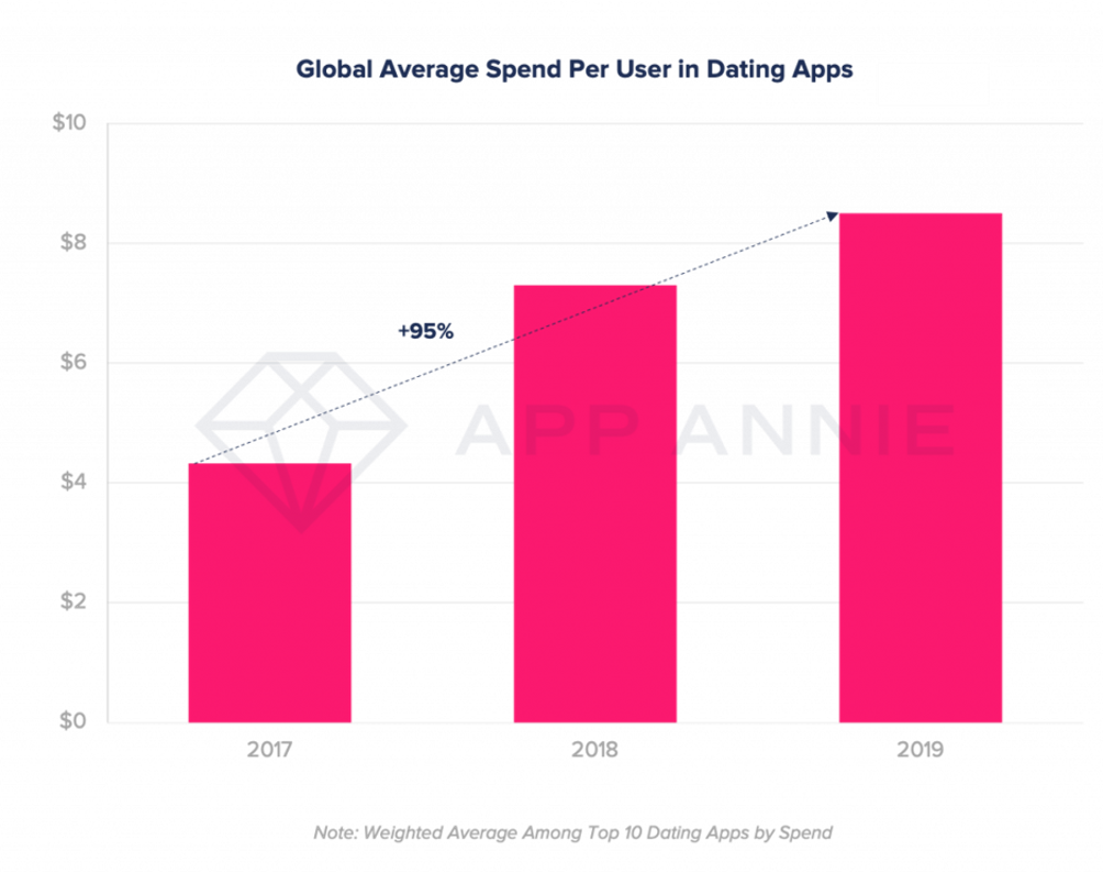 L’ultimo report di App Annie sullo stato della telefonia mobile ha mostrato come le dating app siano ormai diventate uno strumento estremamente popolare per trovare compagnia, con una spesa nel 2019 pari a 2,2 miliardi, il doppio di quanto si spendeva solo due anni fa.