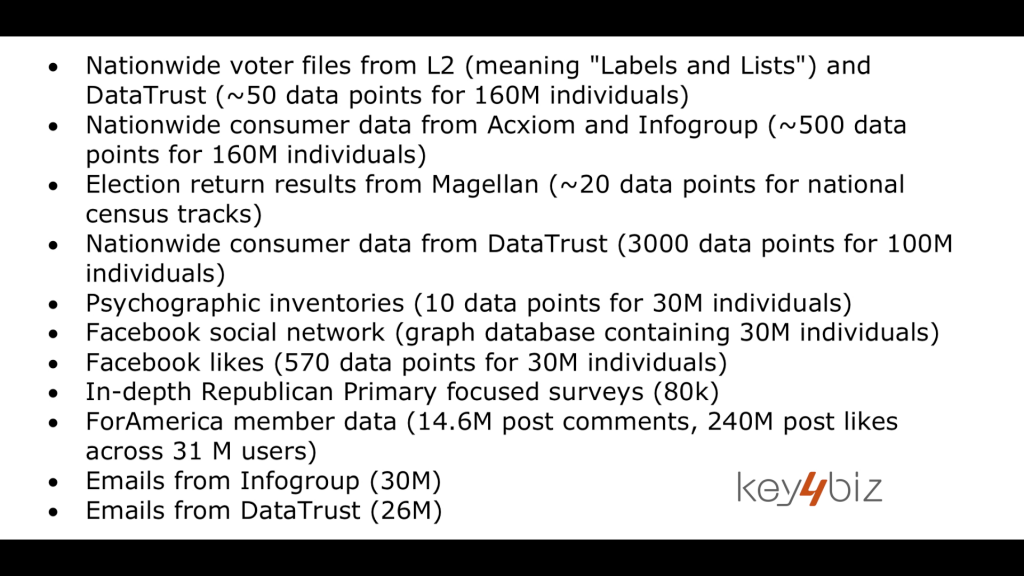 L’indagine dell’ICO ha ridimensionato il numero di dati in possesso di Cambridge Analytica, “non 5.000 data point per individuo su 230 milioni di americani adulti, come Cambridge Analytica invece vantava”, è scritto nel report. Comunque tra i preziosi dati, anche il “graph database” contenente 30 milioni di utenti Facebook.