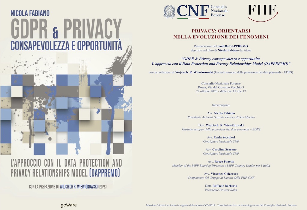 Il prossimo 22 ottobre a Roma, nella sede del Consiglio Nazionale Forense, si terrà l’evento dal titolo “Privacy: orientarsi nell’evoluzione dei fenomeni”, che costituirà l’occasione per presentare l’ultimo libro scritto da Nicola Fabiano, Presidente dell’Autorità Garante Privacy di San Marino, dal titolo “GDPR & Privacy consapevolezza e opportunità. L’approccio con il Data Protection and Privacy Relationships Model (DAPPREMO)”.