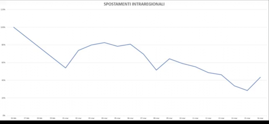 Sala ha mostrato un grafico realizzato con i dati forniti dalle compagnie telefoniche di rete mobile: “Sono movimenti di persone che hanno cambiato cella e quindi spostamenti di 500 metri, di un chilometro o di più. Ringraziamo chi è obbligato ad andare al lavoro per garantire la tranquillità di chi resta a casa ma per tutti gli altri, chi si muove per motivi superflui, stia a casa!”, ha aggiunto.