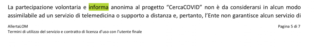 Nell’informativa privacy dell’app si legge che “le risposte al questionario ‘CercaCOVID’ sono anonime” (nei termini di utilizzo c’è anche un errore di ortografia “la partecipazione volontaria e informa anonima al progetto ‘CercaCOVID…).