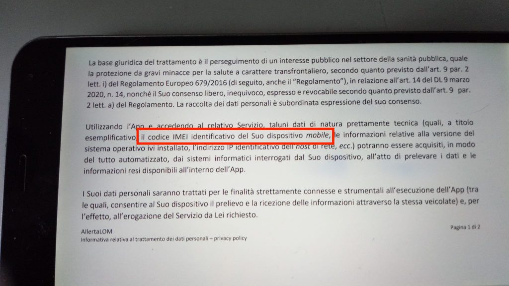 Sempre nell’art. 1 si legge: “Un codice identificativo del Suo dispositivo mobile verrà impiegato per l’invio delle notifiche push relative alle informazioni messe a disposizione dalla Regione Lombardia tramite allertaLOM.” Quindi il device è univocamente identificato.