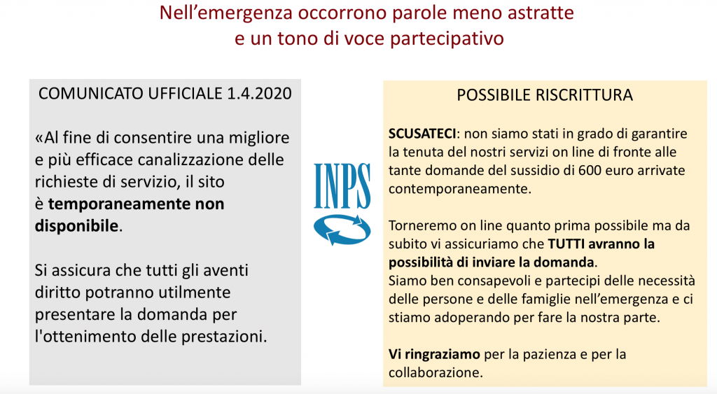 “Scusateci“. Invece, inizia così il comunicato che Marco Stancati, docente di ‘Comunicazione per il management d’impresa’ alla Sapienza Università di Roma, ha riscritto, affermando che in quello di ieri dell’INPS apparso sul sito offline “manca del senso empatico della comunità che sta affrontando una stessa terribile emergenza: l’astratto linguaggio burocratico non ascolta, non si scusa e mantiene assurde distanze”.